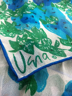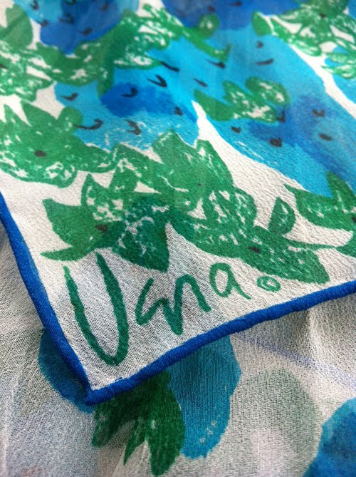 I ran across a scarf like that--bright blue strawberries with green leaves on a gauzy white background. It was quirky and colorful and made me happy--I mean, come on! Blue strawberries? Wonderful! Then I found the signature. And I thought, "Where have I heard that name before?" It sounded familiar but I couldn't quite place it...So, off to the library I went!